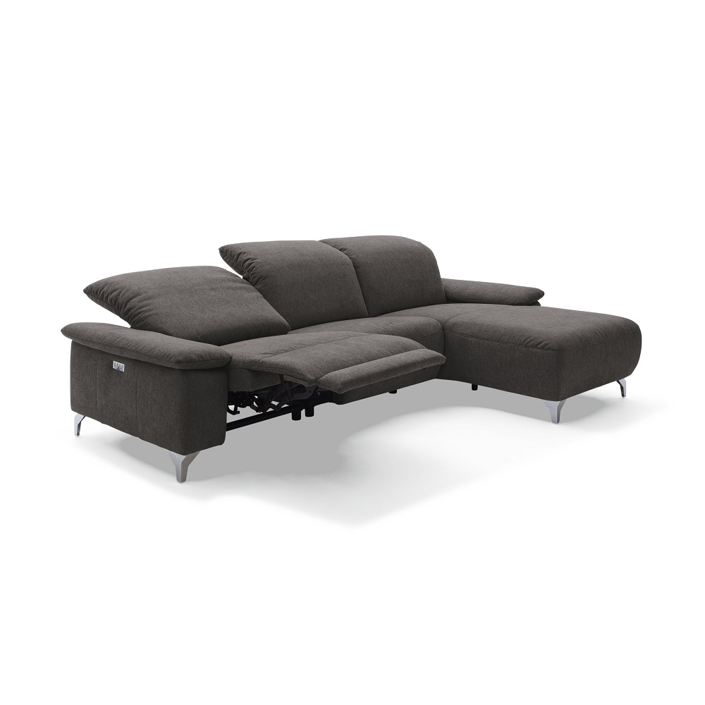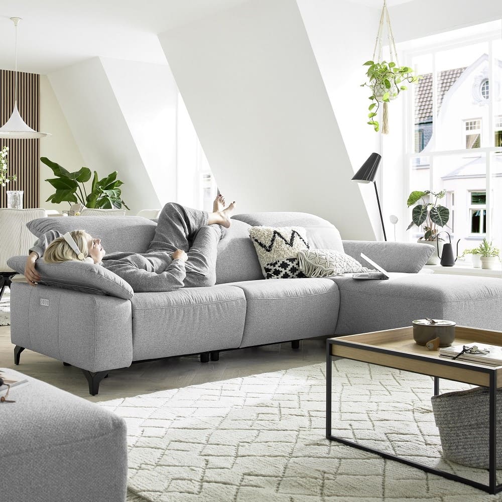 Feierabend und ab auf’s Sofa! Bei dem Modell Musterring MR 370 sind die manuell verstellbaren Kopfteile bereits inklusive. Ein leichtes Ziehen oder Drücken genügt. Eine Besonderheit ist die teilmotorische Relaxdunktion, bei der das Fußteil zu einer Beinauflage verlängert wird. Bedient wird die Relaxfunktion über einen eingearbeiteten Knopf seitlich der Armlehne. Eine weitere Besonderheit der Musterring MR 370 ist die Wall-Free Funktion. Trotz der Relaxfunktion kann das Sofa mit wenig Abstand zur Wand gestellt werden und spart somit viel Platz im Wohnzimmer. Optional ist auch eine verstellbare Armlehne erhältlich. Aus dieser Couch von Musterring möchte man nicht mehr aufstehen.